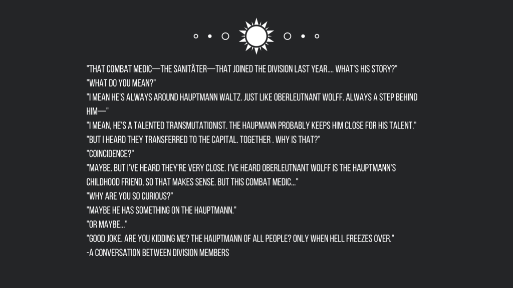 Werner took the medication on the day Maria was to confront Alpha. In his condition, he knew he was only a detriment. He was certain that if Maria confronted Alpha while synchronized, she would have an advantage in battle. However, when he awoke as the medication wore off on the day of, he was met with chaos. Throbbing pain and exhaustion, panicked thoughts, fear, anger, apprehension—it was disorienting but he straightened himself and evaluated the situation.